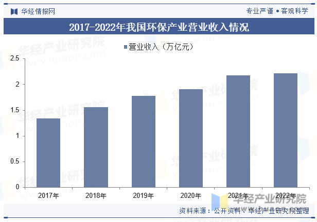 2025年中国环境治理行业市场规模 近年来,我国环保产业工作力度不断加大,在国家政府的鼓励扶持下已进入快速发展阶段,成为了支撑产业经济效益增长的重要力量,产业规模不断扩大。据中国环境保护产业协会统计测算,2022年全国环保产业营业收入约2.22万亿元,较2021年增长约1.9%,2017-2022年的5年间,环保产业营业收入年均复合增长率为10.1%,高于同期GDP增长率。