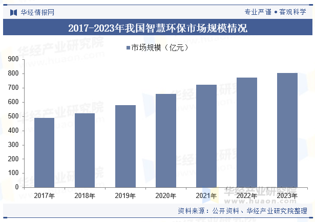 近年来,在互联网技术快速发展下,运用大数据、云计算和物联网等手段智能化治理污染与保护环境,成为环保行业发展的重要方向。数据显示,我国智慧环保市场规模由2017年的489亿元增长至2023年的805亿元,年均复合增长率为8.66%。
