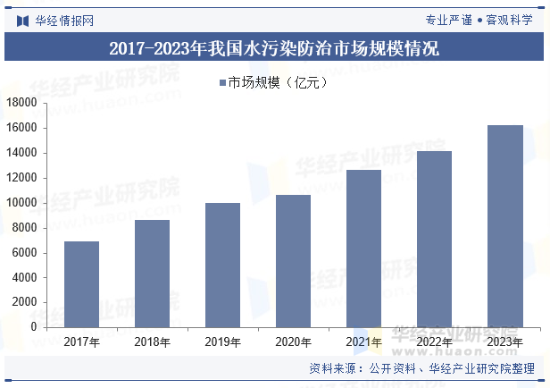 水污染治理是主要受政策引导的行业,2015年4月国务院颁布《水污染防治行动计划》正式开展中国对于水污染的全面治理,随后各类型政策密集颁布,全面促使着行业健康稳健的发展。目前,水污染治理行业作为环保领域最为成熟的板块,市场规模巨大,2023年市场规模约为16286.8亿元,同比增长14.78%。