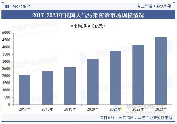我国大气环境形势严峻,在传统烟煤型污染仍未得到较好控制的情况下,以臭氧、可入肺颗粒物(PM2.5)和酸雨为特征的区域性复合型大气污染问题日益突出,区域内空气重污染现象大范围同时出现频次日益增多,严重制约社会经济的可持续发展,危害居民身体健康。自2013年国家发布《大气污染防治行动计划》以来,我国大气污染防治、减排与控制工作取得了长足进步,并间接带动了该领域市场规模的快速增长。2023年中国大气治理行业市场规模约为4665亿元。这一数字显示了大气污染防治行业在当前的强劲发展势头。