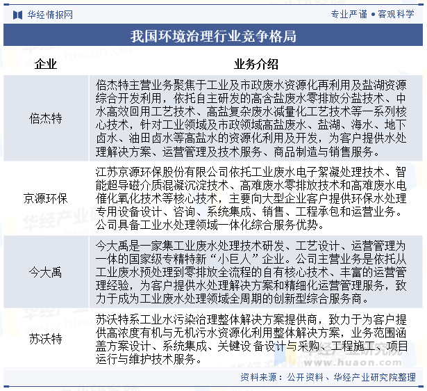 本文节选自华经产业研究院发布的《2024年中国环境治理行业发展现状及趋势分析,碳达峰、碳中和等政策为行业提供有力支撑,环保产业发展充满机遇「图」》,如需获取全文内容,可进入华经情报网搜索查看。 我国环境治理产业主要市场参与者有大型央企和国企、民营企业以及外资企业和跨国公司。大型央企和国企在环境治理行业中占据重要地位,凭借强大的资金实力、技术储备和市场影响力,积极参与各类环境治理项目的建设和运营。随着环保政策的不断推进和市场需求的增长,越来越多的民营企业涌入环境治理行业。这些企业通常具有灵活的经营机制和敏锐的市场洞察力,能够在特定领域或细分市场中找到发展机会。一些外资企业和跨国公司也通过合资合作等方式进入我国环境治理市场。它们带来了先进的技术和管理经验,为我国环境治理行业的发展注入了新的活力。